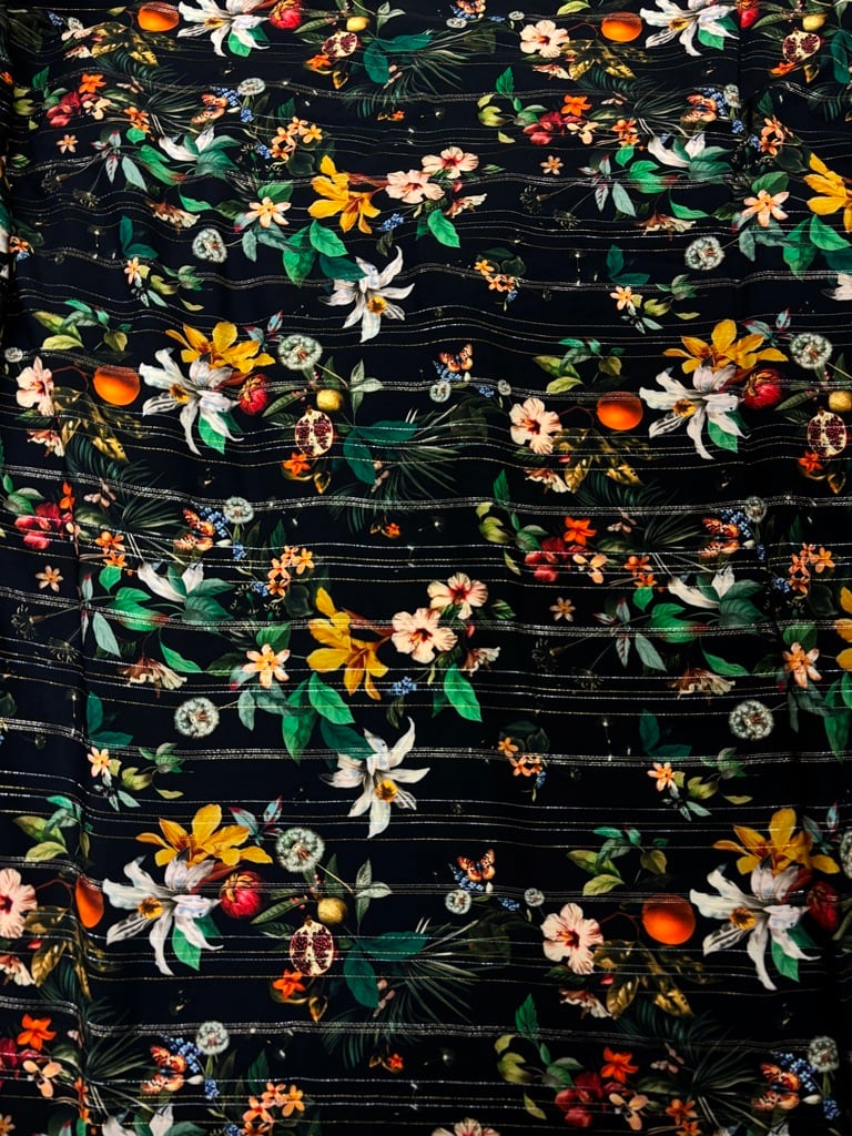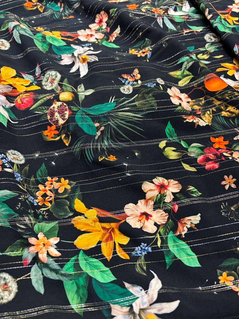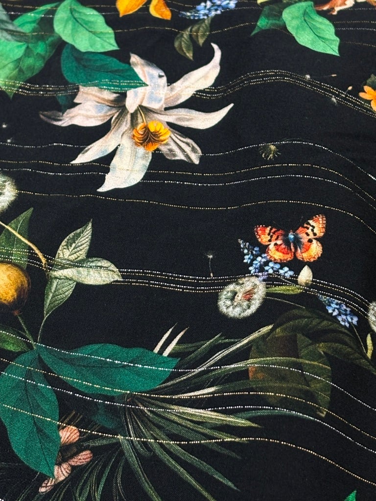 なめらかな落ち感のあるビスコースに、ラメ糸を織り込んだ上品な光沢感のある生地は、鮮やかなボタニカルフラワープリント。