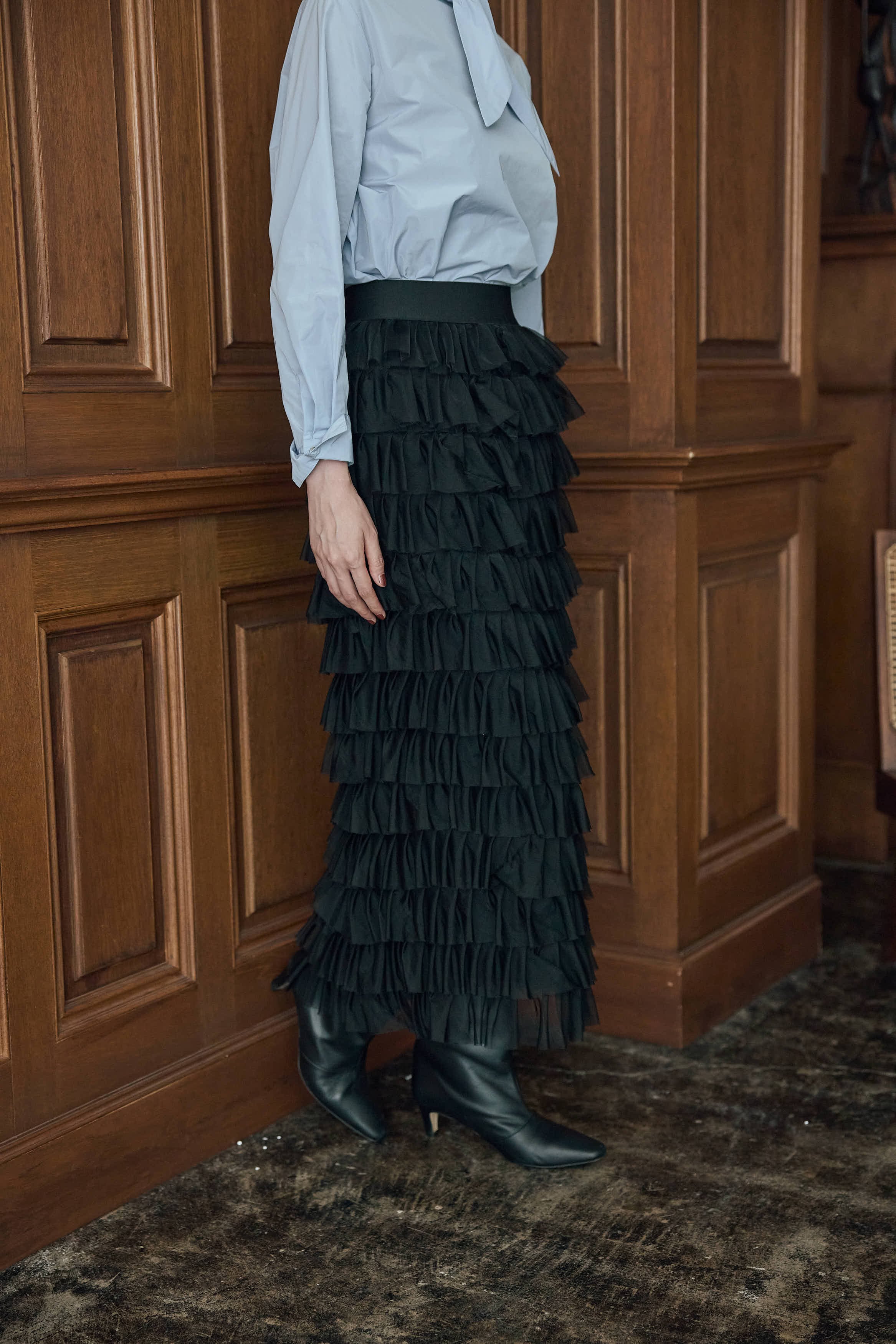 存在感のある、ティアードオーガンジータイトスカートは、がさっとした質感で甘すぎない印象に。