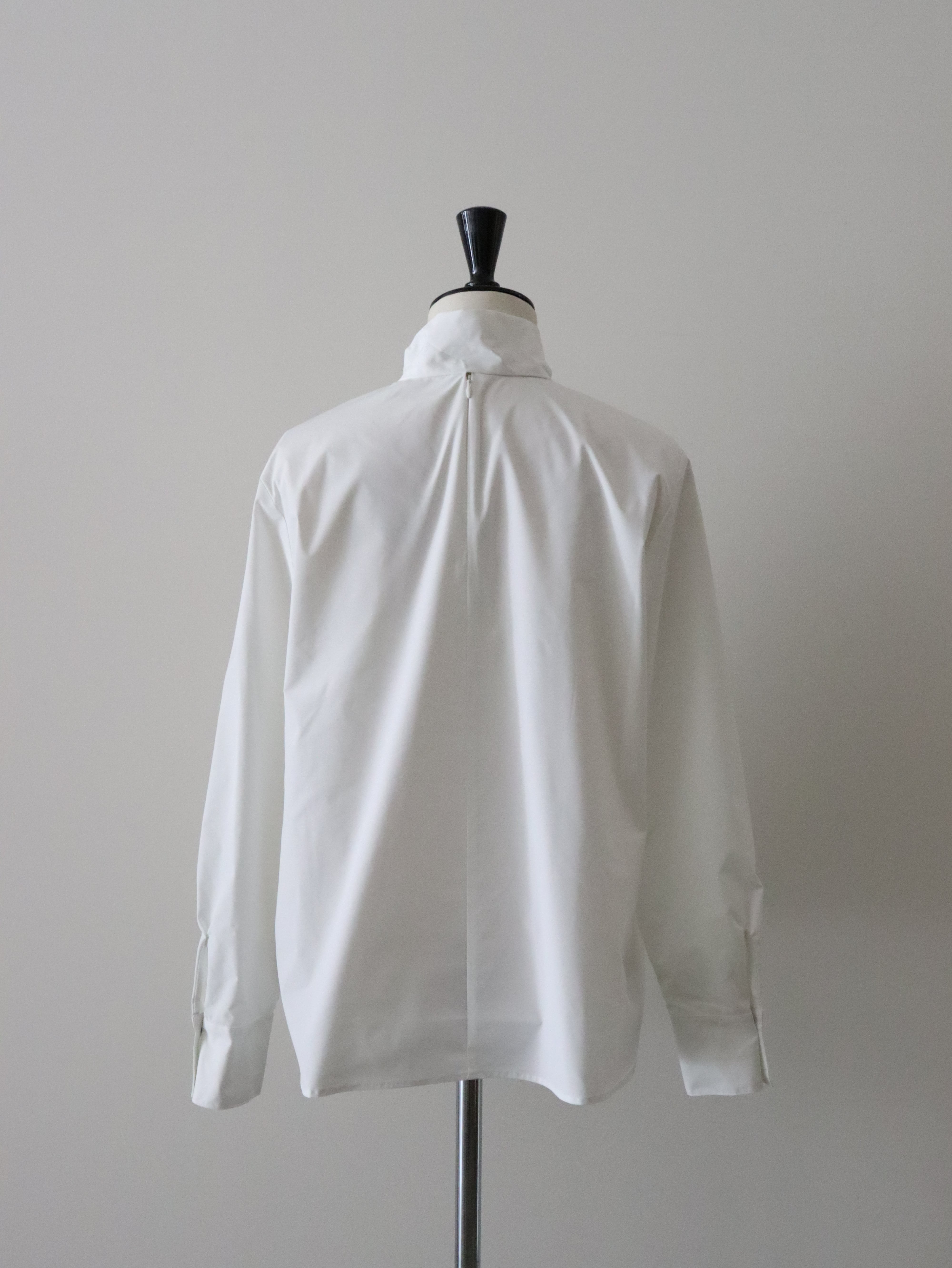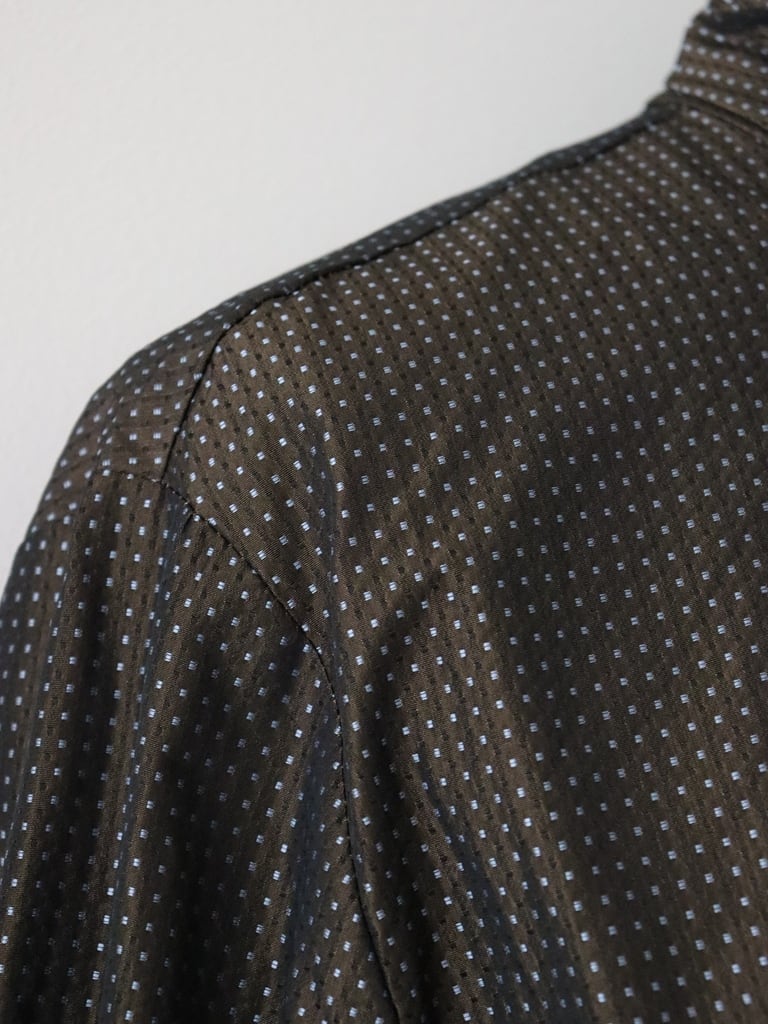 シワになりにくい、マットなポリエステルタフタベースに、リサイクルポリエステルを使い、刺子調に織られたドットボウタイブラウス