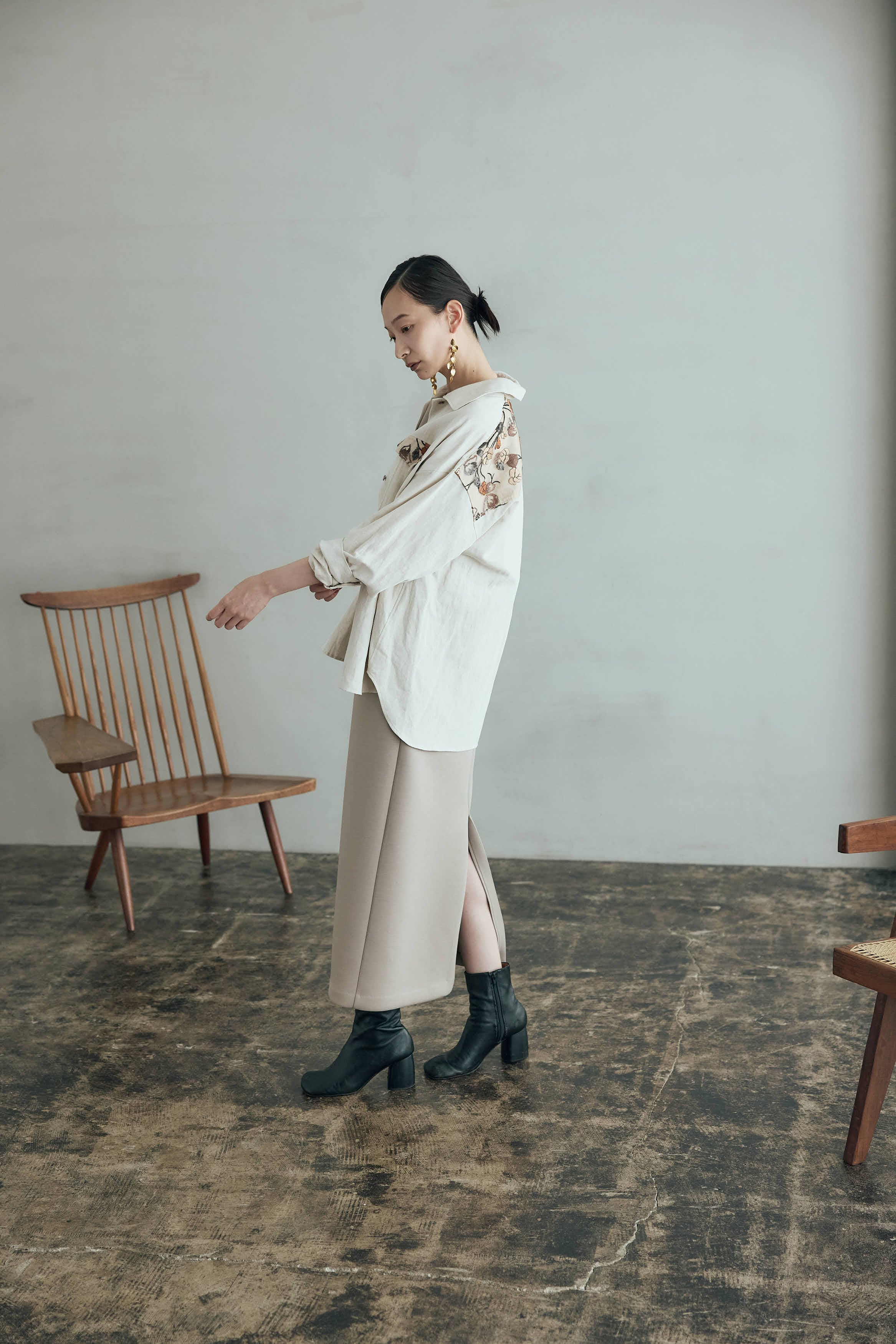 サテンやダンボール、キレイめな素材感と合わせて、オトナカジュアルにするときちんと感が出てスタイリングしやすい。