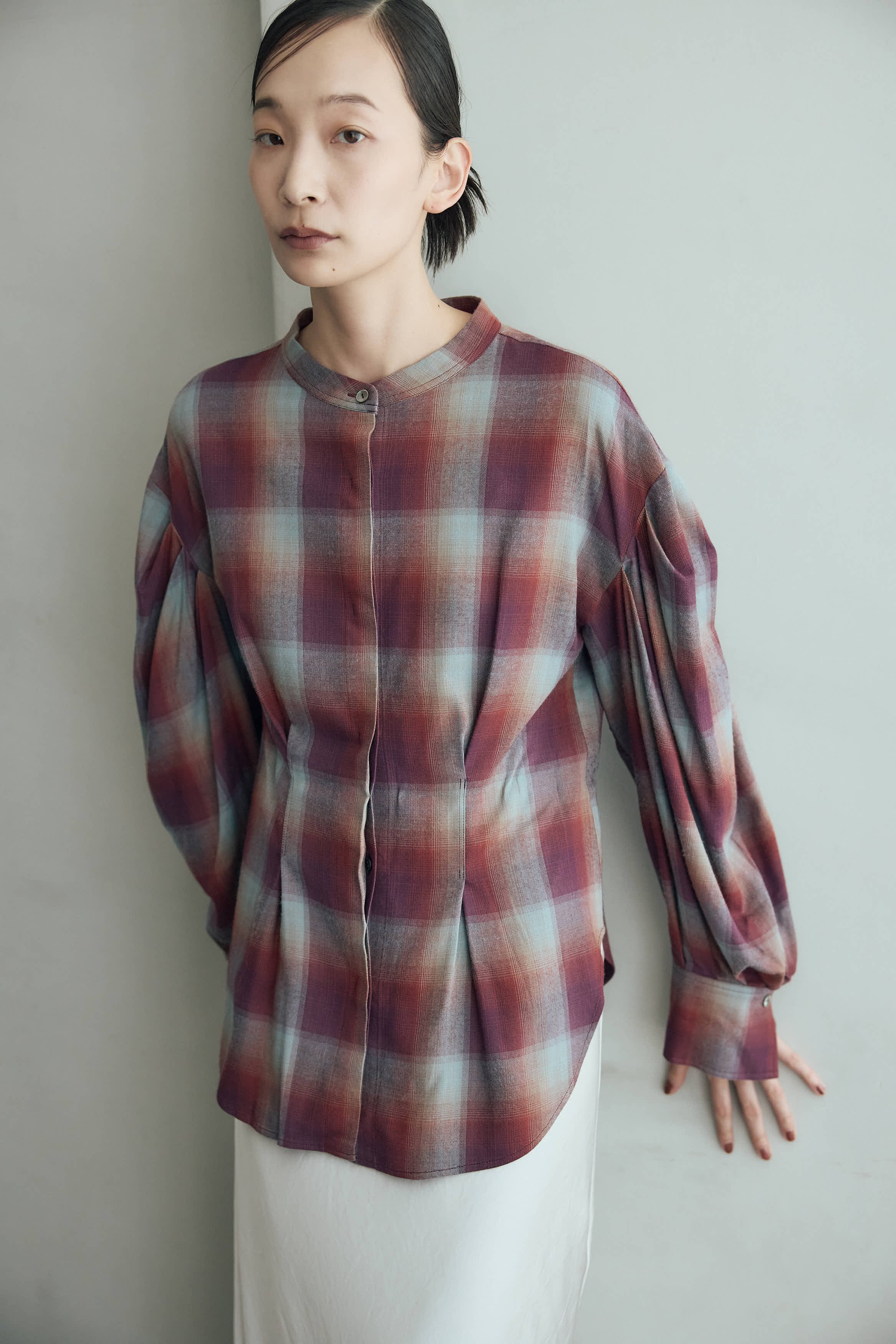 柔らかなニュアンスカラーのチェック柄が目を惹くブラウス