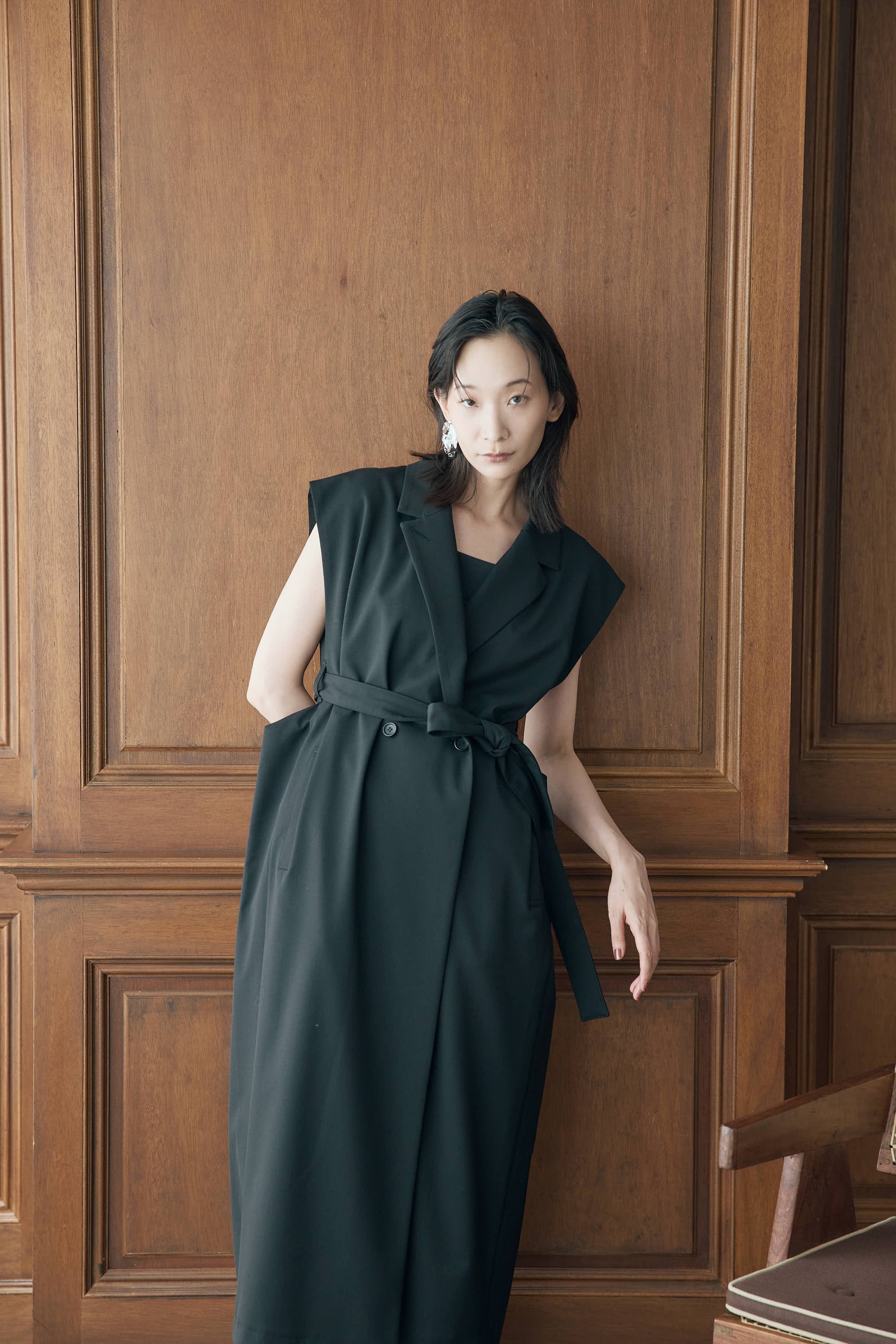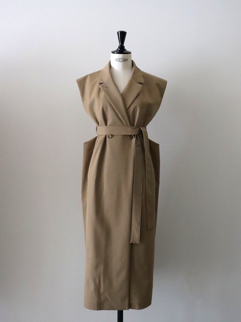 ベルト付きジレはウエストを引き締め、洗練されたバランスを生み出してくれます。