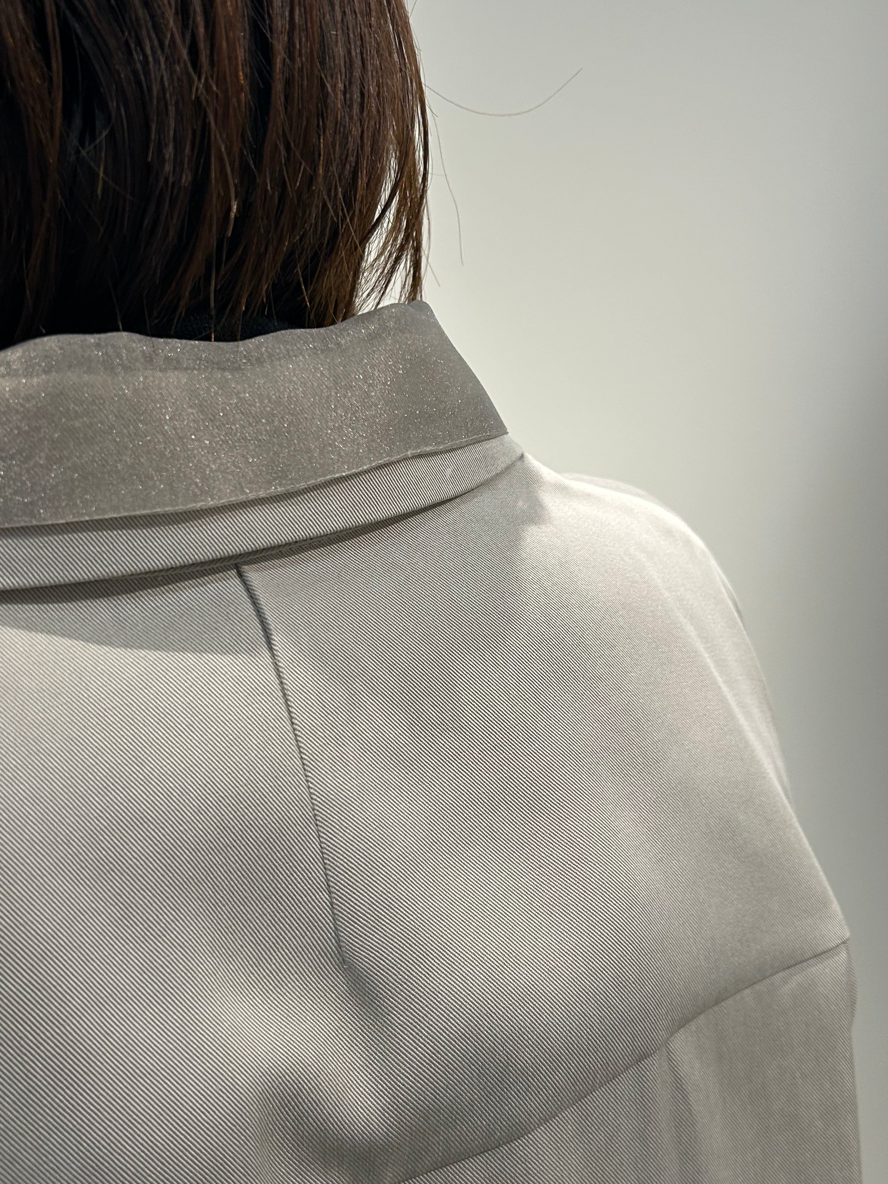 襟と袖口に施されたオーガンジーの重ねデザインが、エレガントで洗練された印象を与えます。
