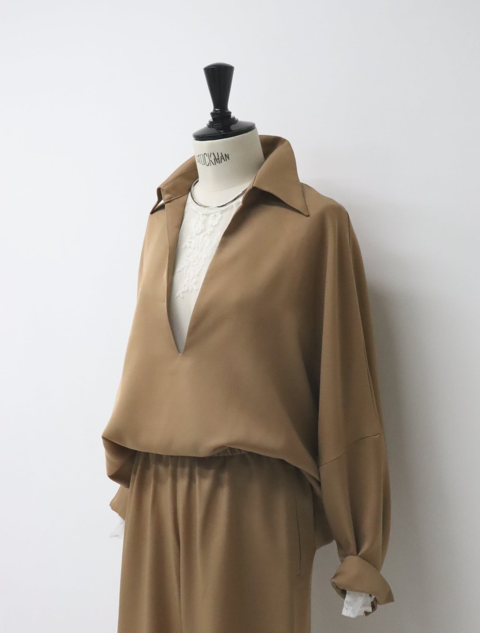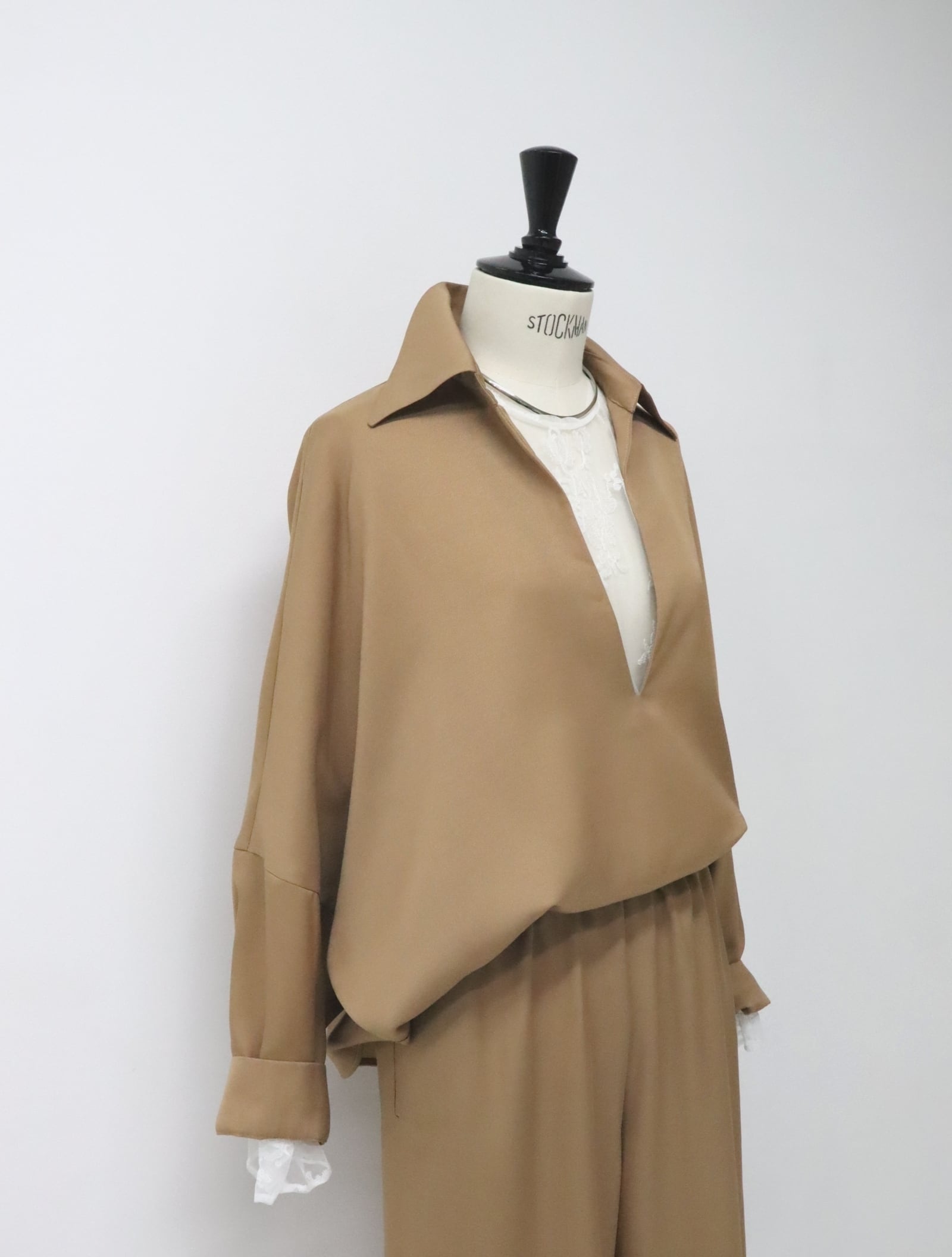深めのスキッパー襟が抜け感を演出し、シンプルながらも存在感のあるデザインに仕上げています。