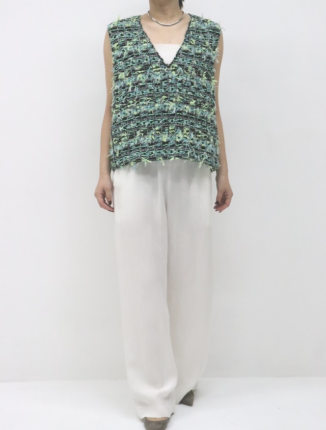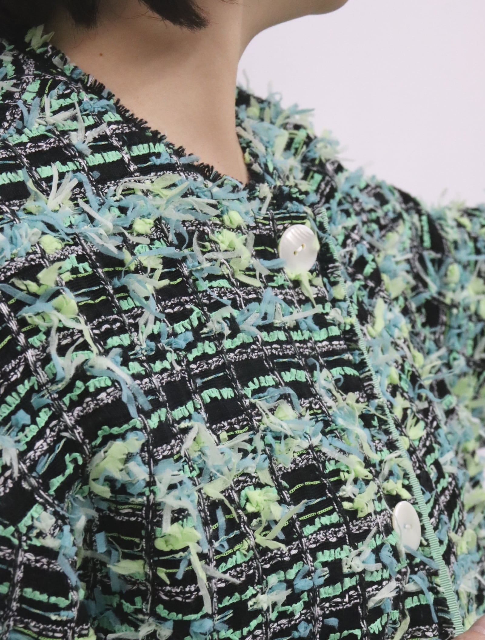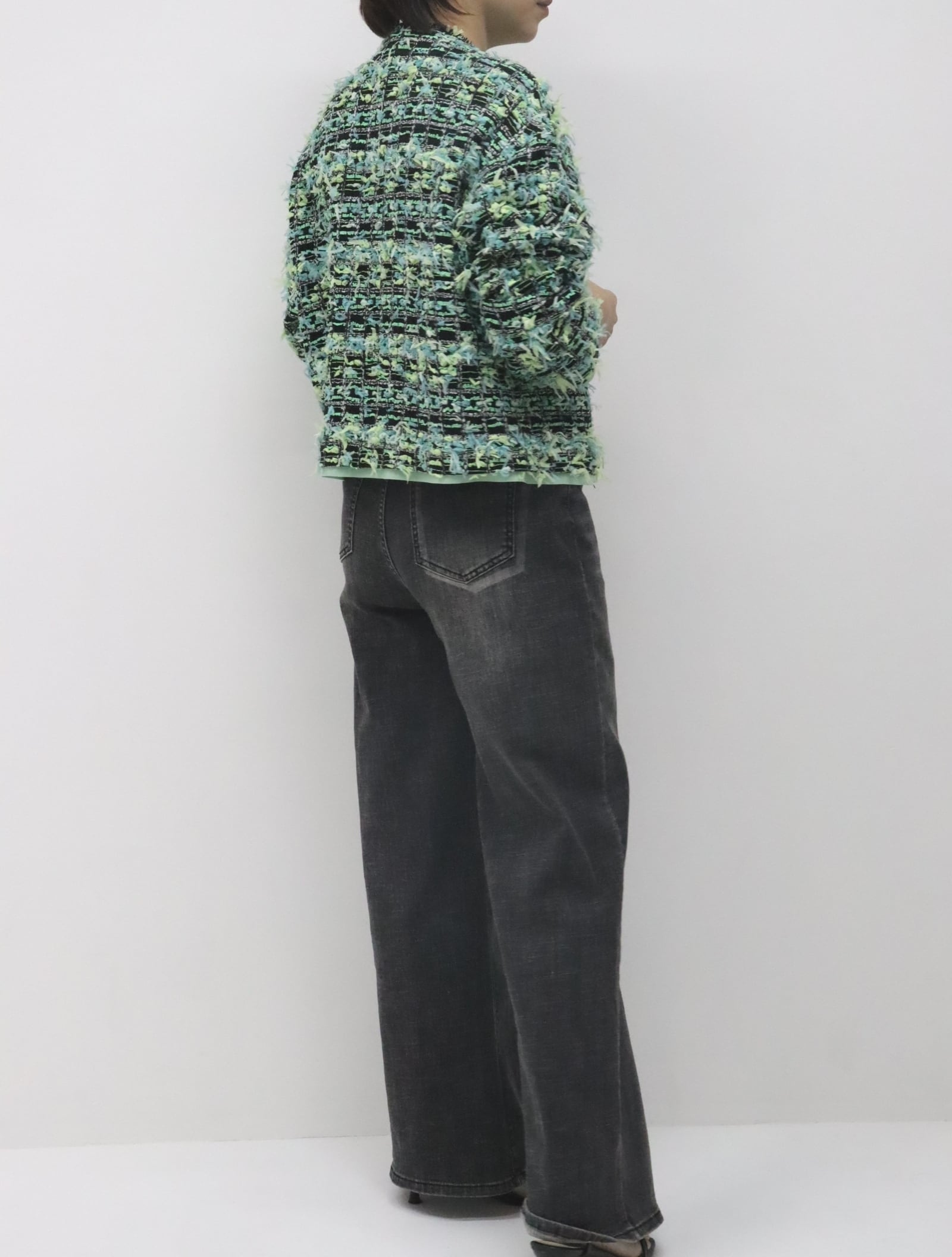 今季らしい軽やかさのあるツイードで、羽織り感覚で取り入れられる一着です。