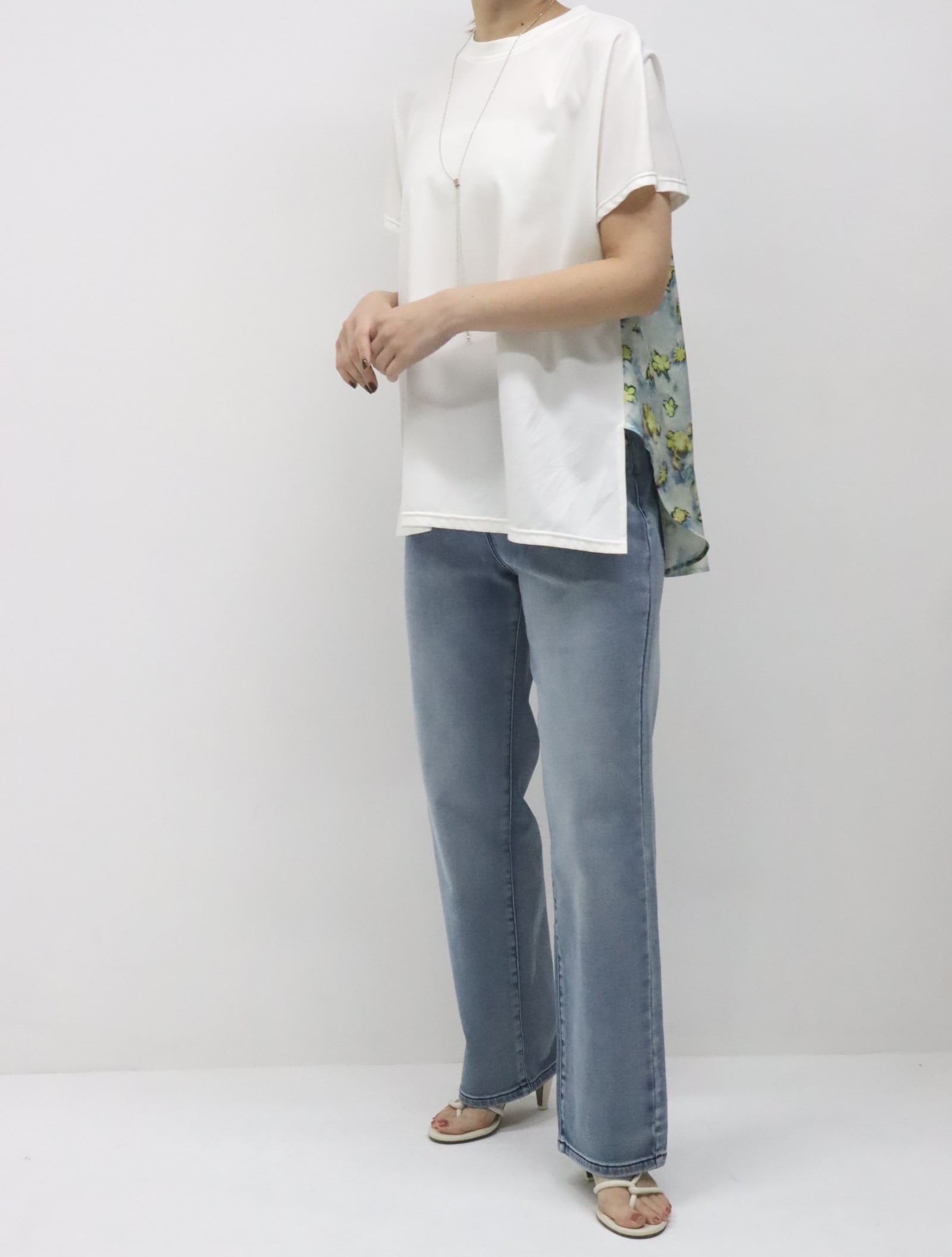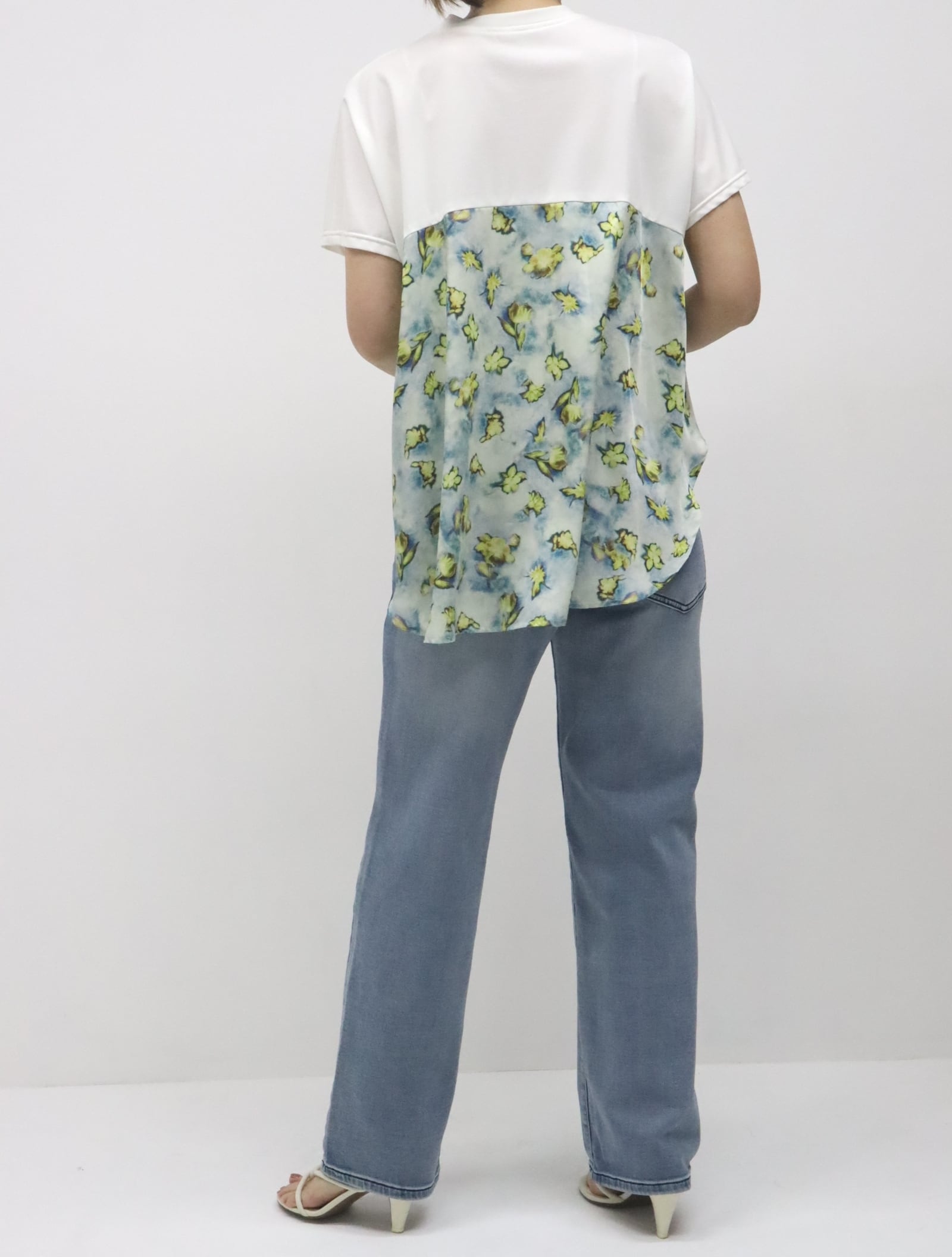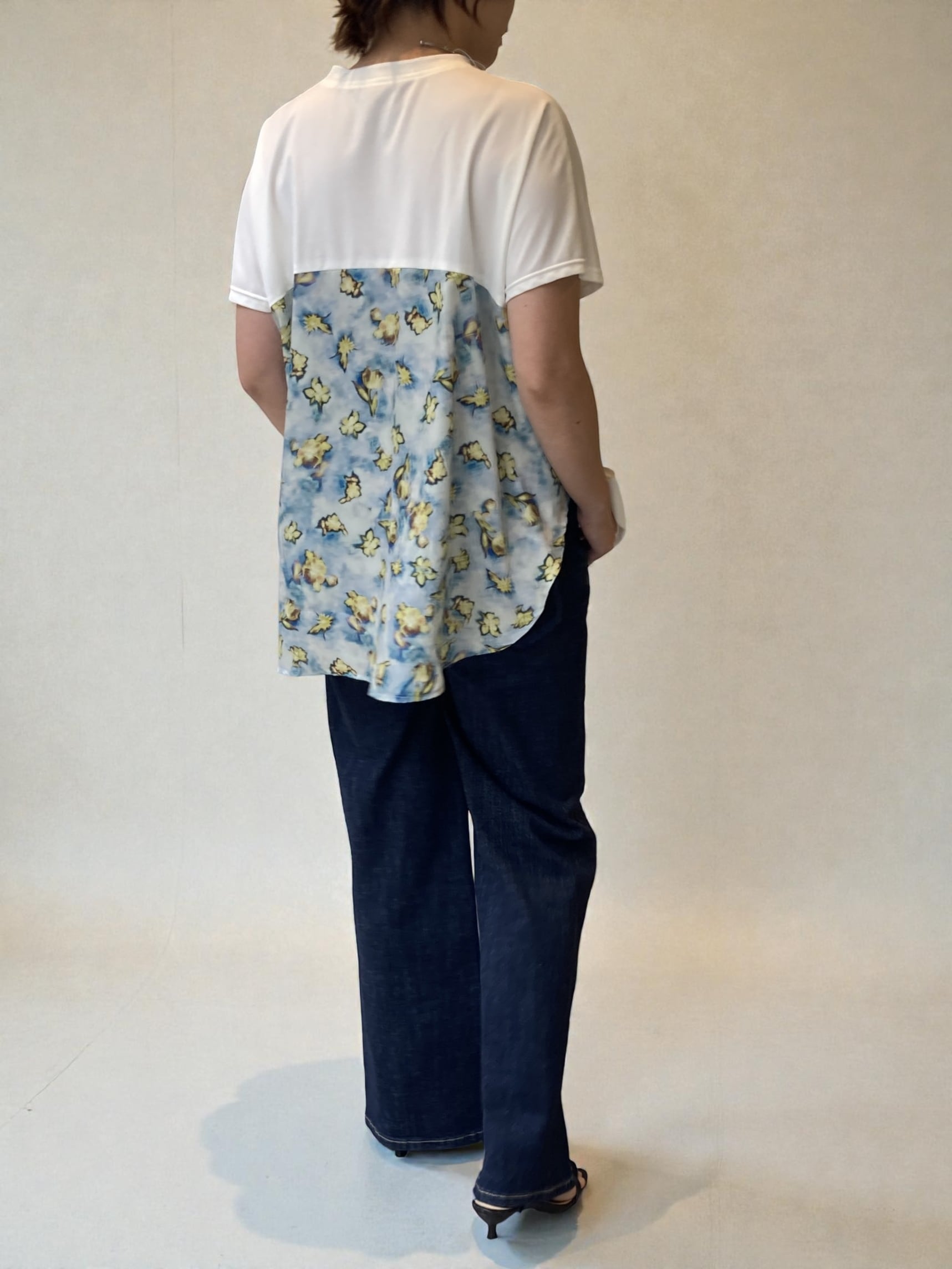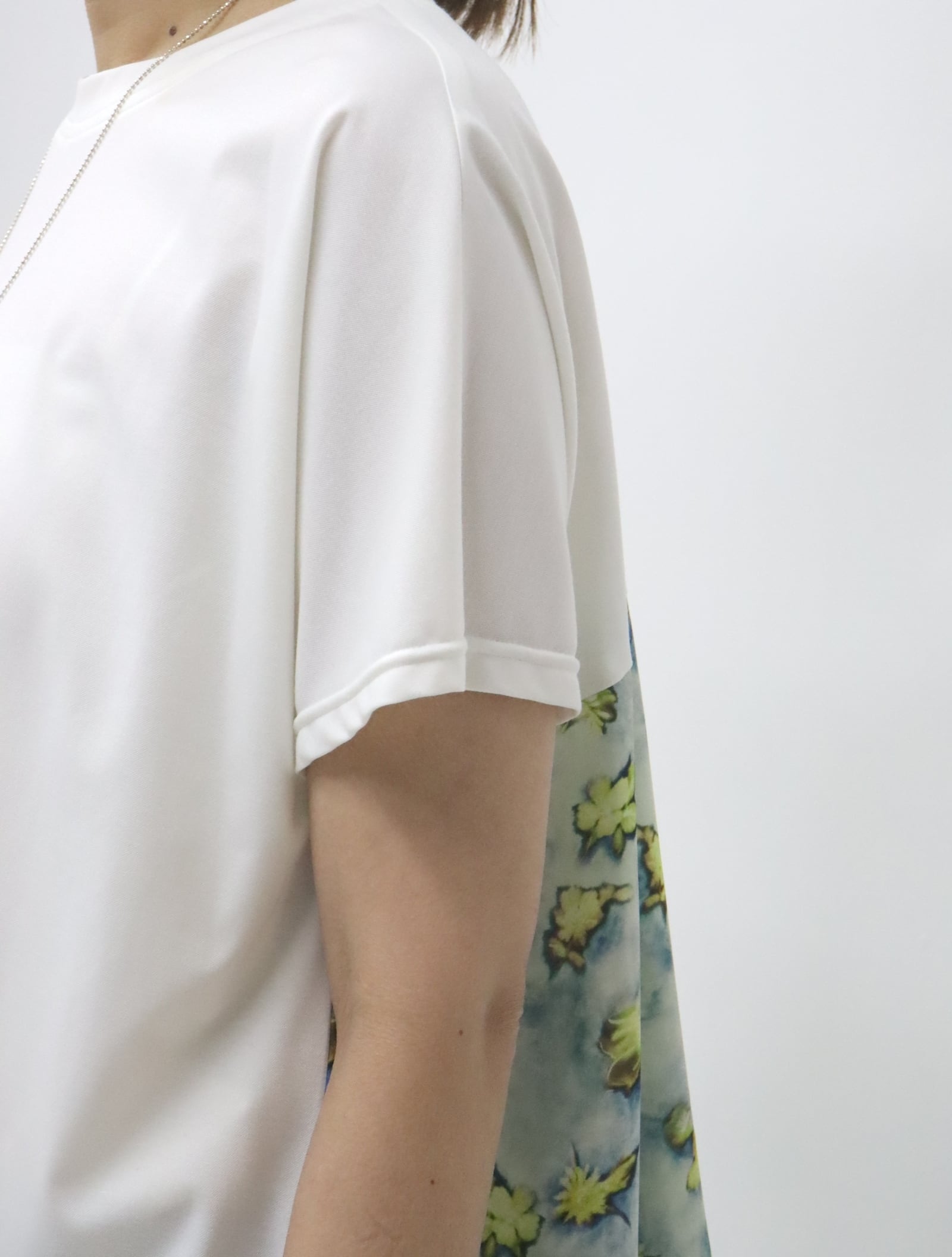 フロントはシンプルな無地、バックスタイルにプリント素材を使用したデザインカットソー。