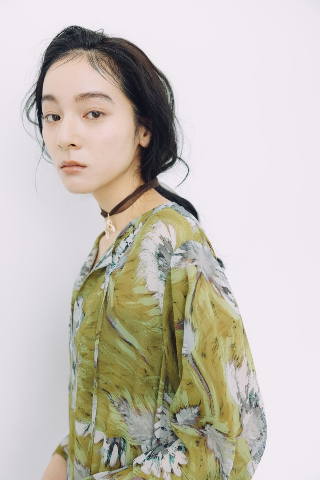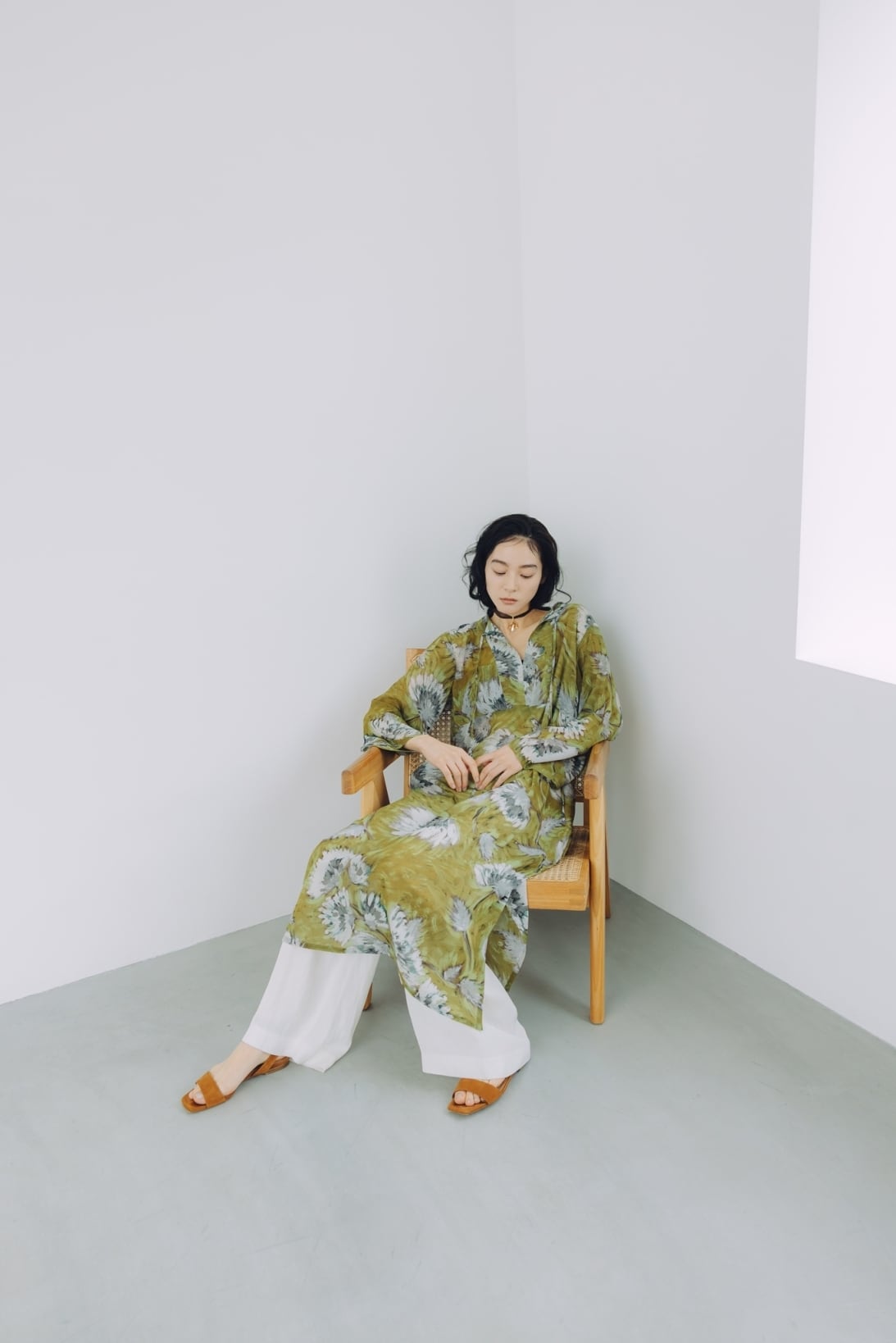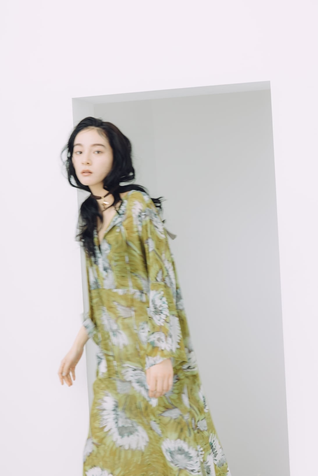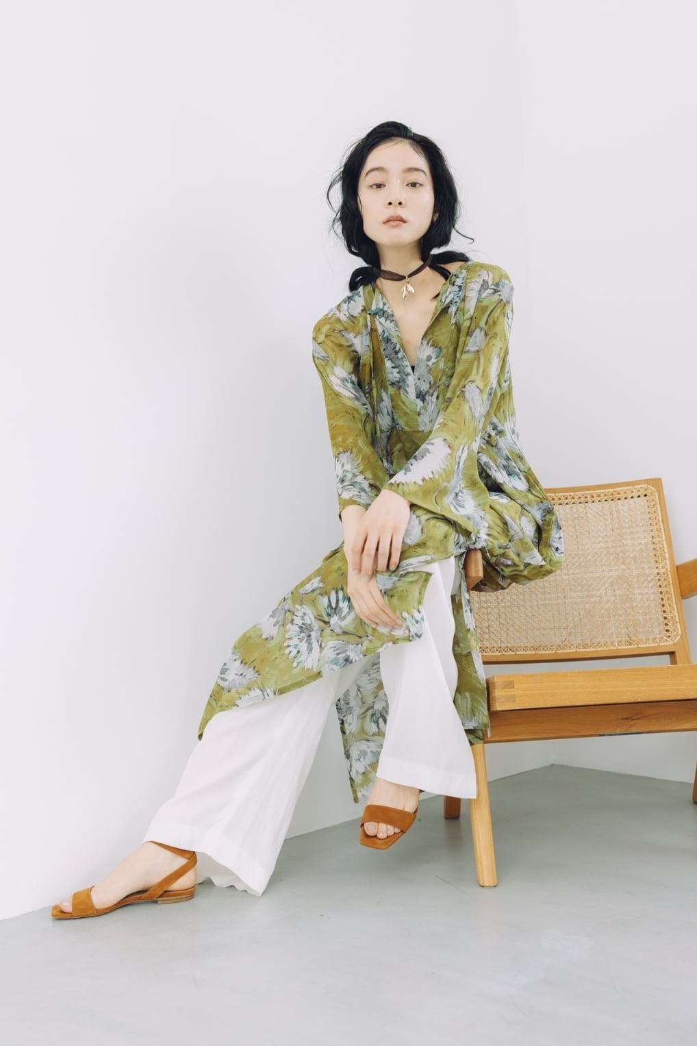 落ち着いたトーンのプリントが華やかさを添えながらも、